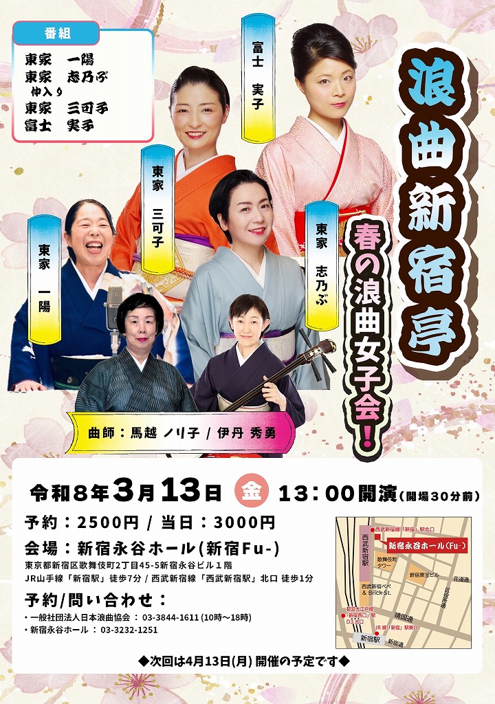 第32回、令和8年3月15日(日)の「泉岳寺浪曲会」は14時から鳳舞衣子、港家小そめ、東家志乃ぶの出演です。