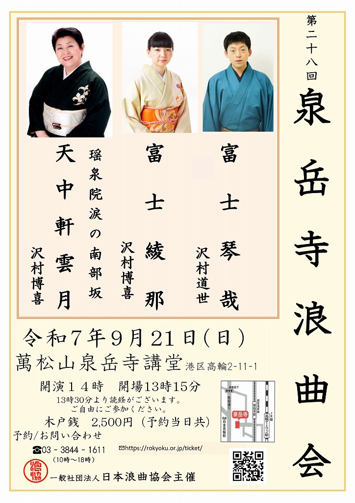 / 最終更新日 : rokyo 泉岳寺 第二十八回泉岳寺浪曲会 忠臣蔵の聖地、東京都港区高輪の泉岳寺に於いて、隔月公演で「泉岳寺浪曲会」が行われております。 第28回、令和7年9月21日(日)の「泉岳寺浪曲会」は14時から天中軒雲月、富士綾那、富士琴哉の出演です。 演目は忠臣蔵を中心にさまざまな演目でお客様に楽しんで頂きます。 ご予約のうえ、どうぞご来場下さいませ。 ご来場を心よりお待ちしております。 一般社団法人 日本浪曲協会 FacebookXCopy